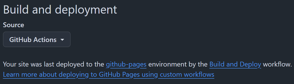 到config.yml確定你的url設定正確,然後就跟最一開始說的一樣,弄github page就好了。 不過這次在page那邊的Bulid and Deployment的Source要選Github Actions,之後只要推送任何東西,就會自動觸發Actions工作流程,建置完後網站就會自動部屬了。