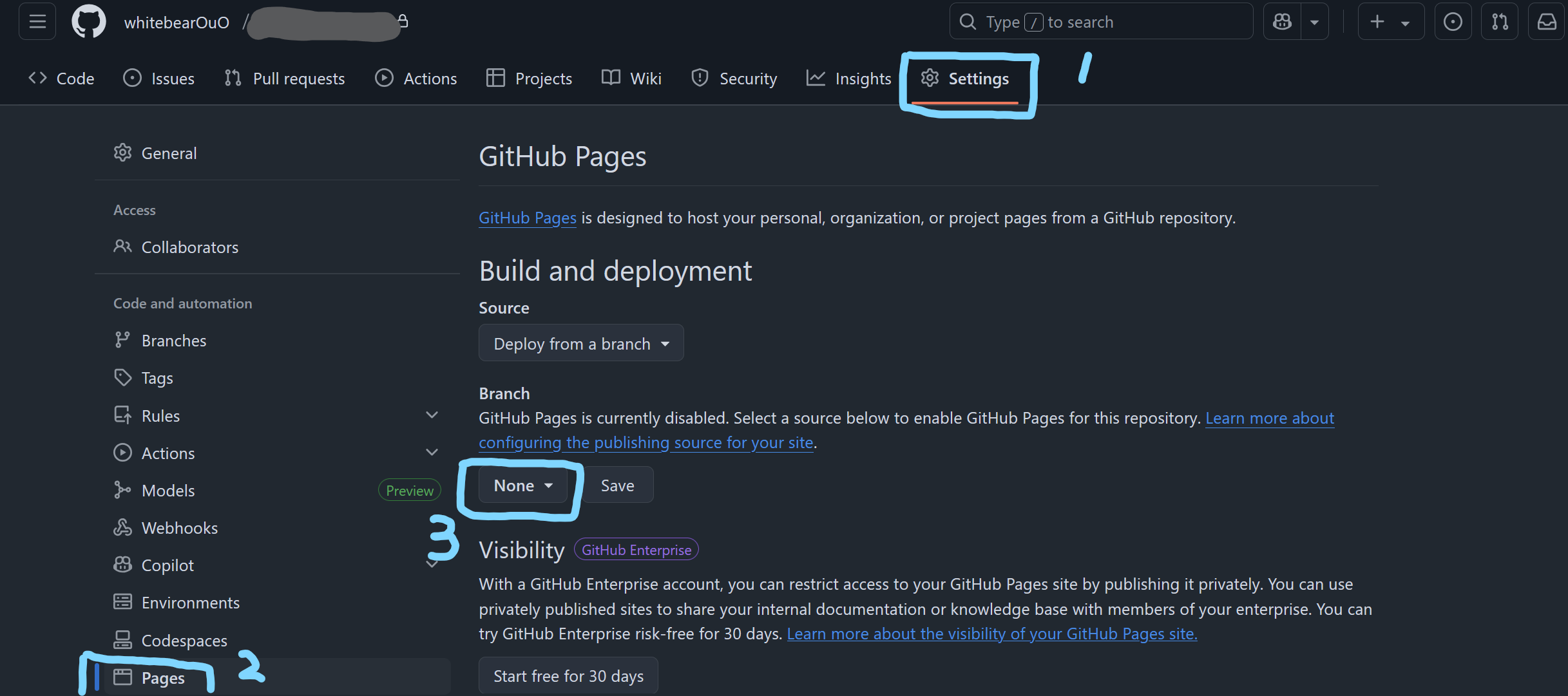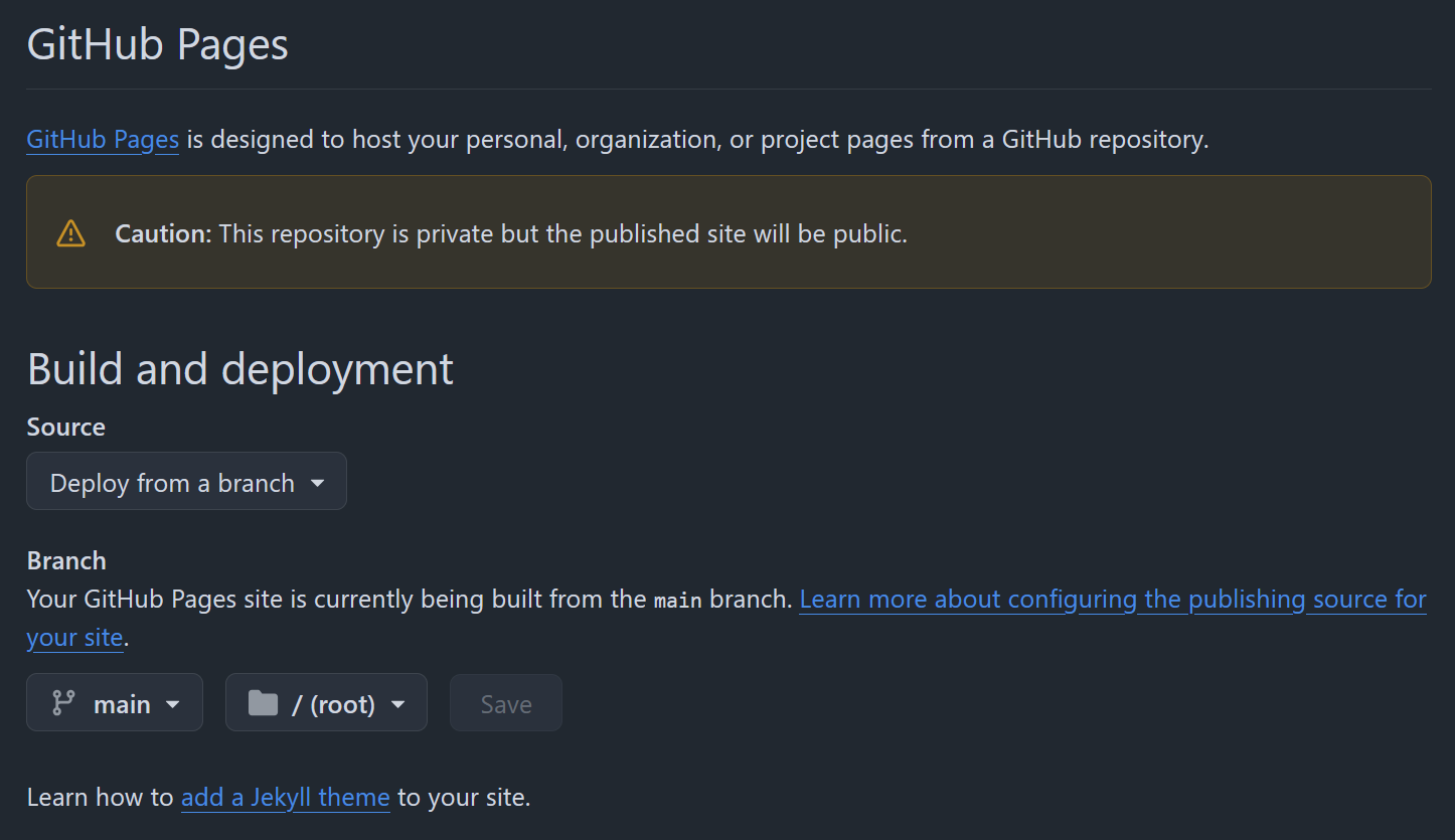 他上面有一個小提醒,因為我的repo是私人的,但page還是公開的。